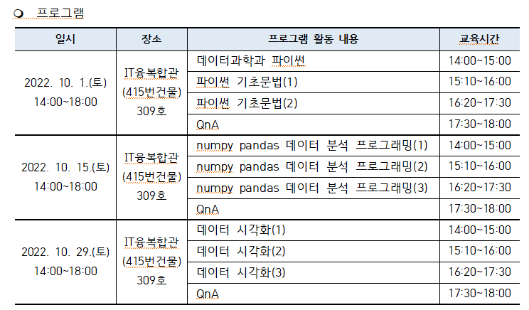 2022년도 가을학기특강[데이터 사이언스 인재양성] 신청자 명단 일정별 명단(첨부파일)을 꼭 확인 하시어 특강에 참석하시기 바랍니다. 자세한 내용은 첨부파일 또는 교육생 명단보기에서 확인하시기 바랍니다. 교육생 명단 보기!! (클릭)문의)950-6423,6425본 과학영재교육원은 과학기술진흥기금과 복권기금의 재원으로 과학기술정보통신부의 지정을 받아 한국과학창의재단의 지원으로 운영됩니다.