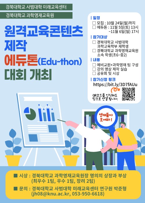 경북대학교 사범대학 미래교육센터에서 "지역 교육격차 해소를 위한 원격교육 콘텐츠 제작 에듀톤(Edu-thon) 대회 "를 개최하오니 관심있는 과학영재교육원 재학생의 많은 참여를 부탁드립니다.