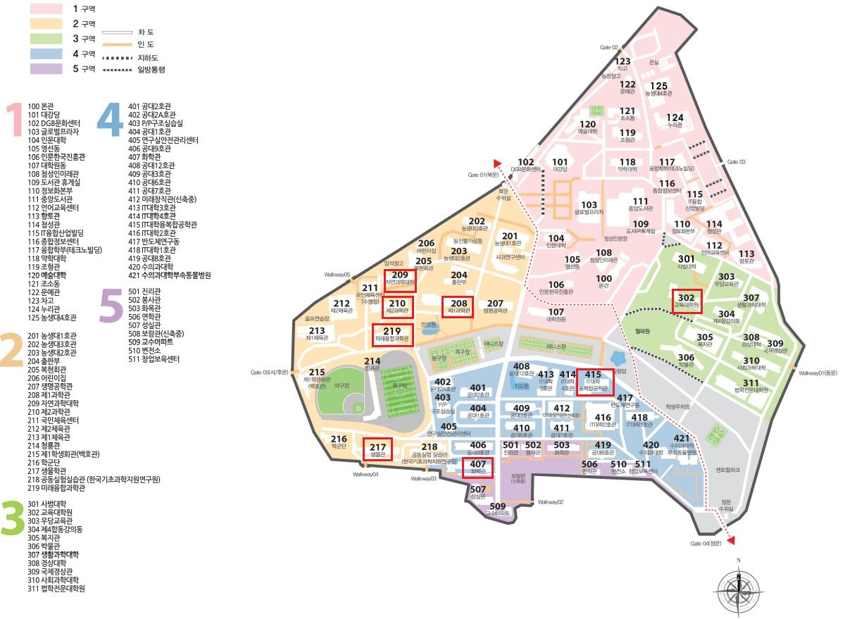 ※ 안내한 건물 번호를 아래의 캠퍼스 지도를 통해 확인하여 착오 없이 수업에 참여해주시기 바랍니다.