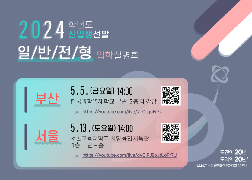 2024학년도 한국과학기술원(KAIST) 부설 한국과학영재학교 신입생 선발 일반전형 입학설명회 안내입니다. 부산 지역 : 5/5(금), 14:00, 한국과학영재학교 본관 대강당(유튜브 생방송 동시 진행) 서울지역 : 5/13(토), 14:00, 서울교육대학교 사향융합체육관 1층 그랜드홀(유튜브 생방송 동시 진행)♦ 유튜브 주소 및 QR 코드는 아래 포스터 또는 첨부파일에서 확인하시기 바랍니다. 본 과학영재교육원은 과학기술진흥기금과 복권기금의 재원으로 과학기술정보통신부의 지정을 받아 한국과학창의재단의 지원으로 운영됩니다.