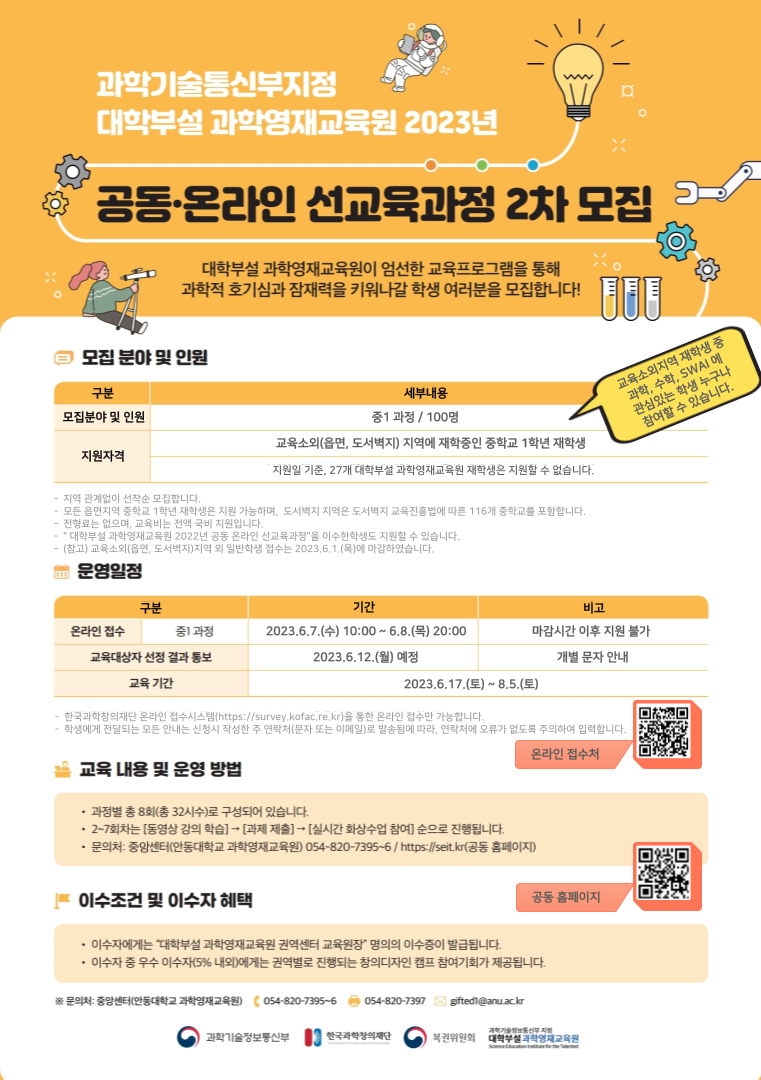 - 문의처: 문의처: 27개 대학부설 과학영재교육원 중앙센터(안동대학교 과학영재교육원)