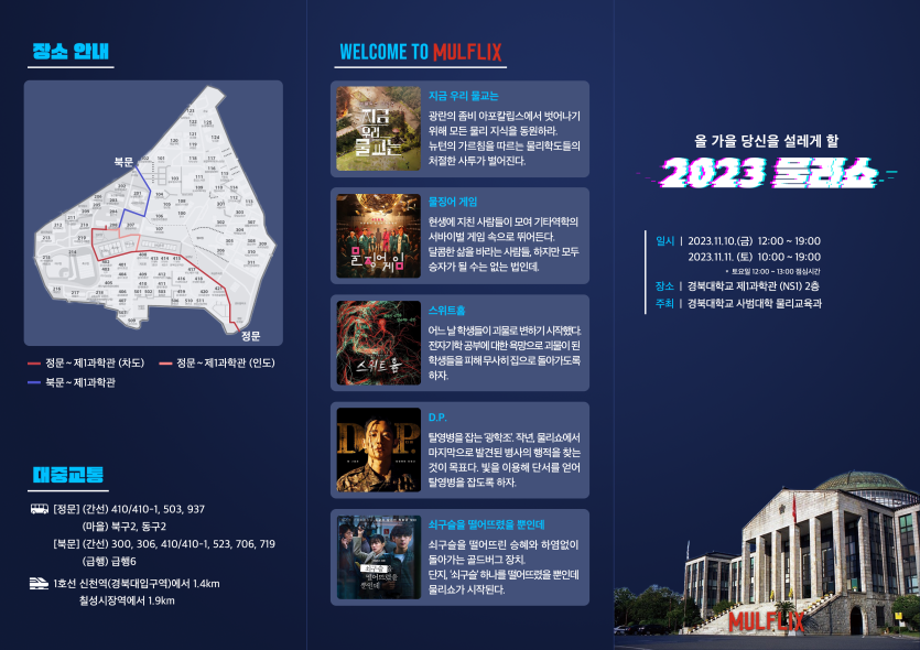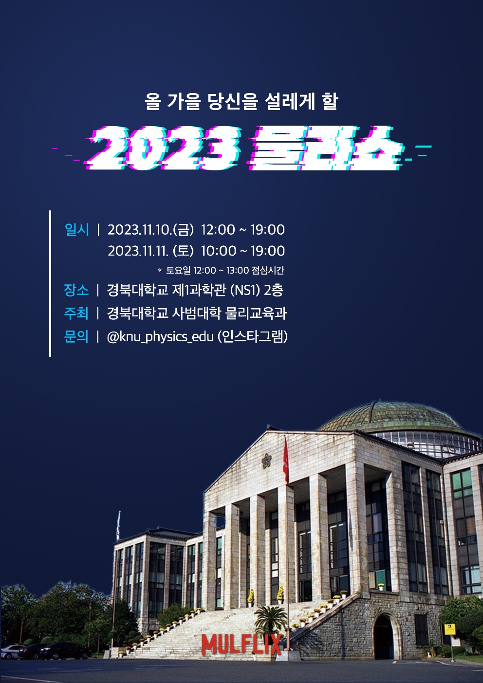 - 경북대학교 사범대학 물리교육과 1·2학년들이 주최하는 2023 물리쇼 페스티벌은 11월10일(금)부터 11월 11일(토)까지 이틀에 걸쳐 진행됩니다.
