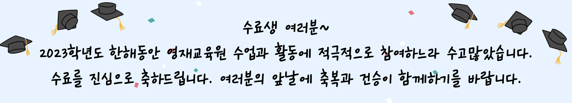※ 수령하지 못한 수료증 및 개별자료집은 수료식 이후 2024. 2.26(월)부터 과학영재교육원 행정실에 방문하여 수령하시기 바랍니다.