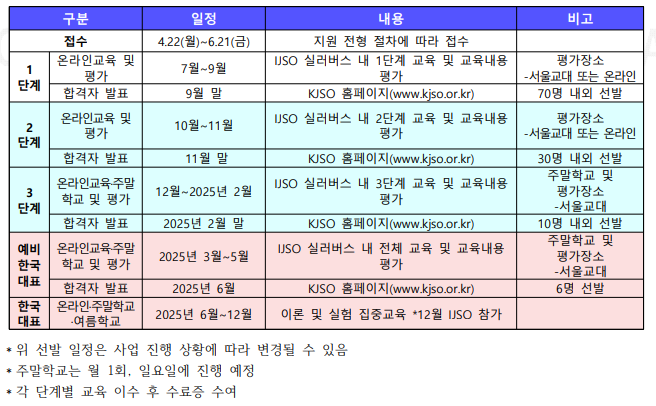 - 자세한 내용은 2025 KJSO 모집 안내(보러가기) 및 2025 KJSO 및 IJSO 소개(보러가기) 에서 확인하시기 바랍니다.