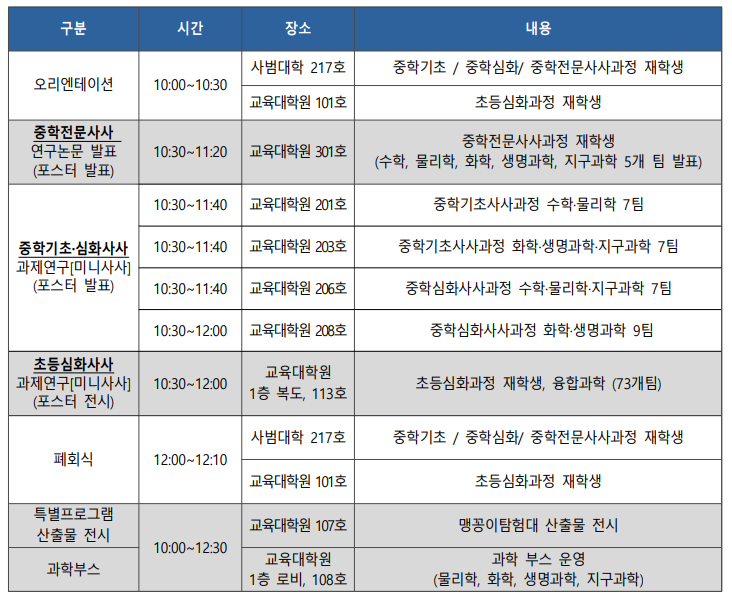 •  기초과정: 수학 4팀, 물리학 3팀, 화학 3팀, 생명과학 3팀, 지구과학 1팀 총 14개 팀 발표