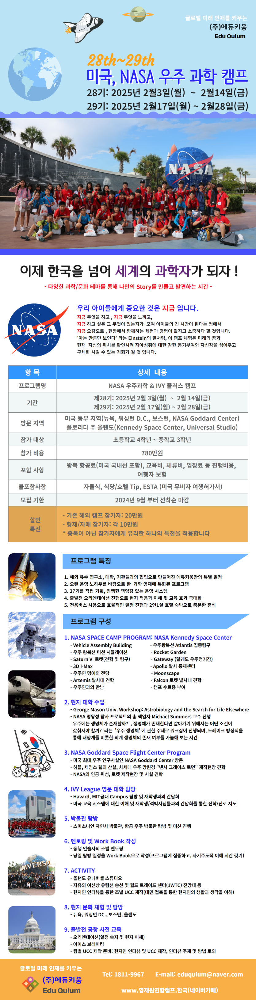 오는 10월 5일(토요일), 미국 NASA우주과학 캠프설명회 안내를 드립니다.
