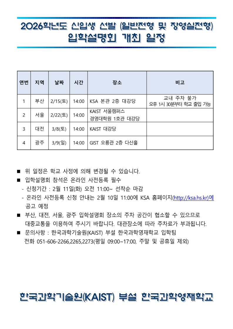 [홍보]한국과학기술원(KAIST) 부설 한국과학영재학교 입학설명회 개최 일정 안내