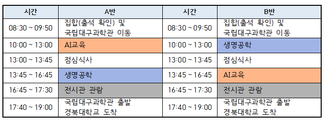 - 귀가장소: 경북대학교 학생주차장 (도착 19:00 , 개별귀가) , 국립대구과학관(꿈나무과학관: 수업종료 17:30, 개별귀가)